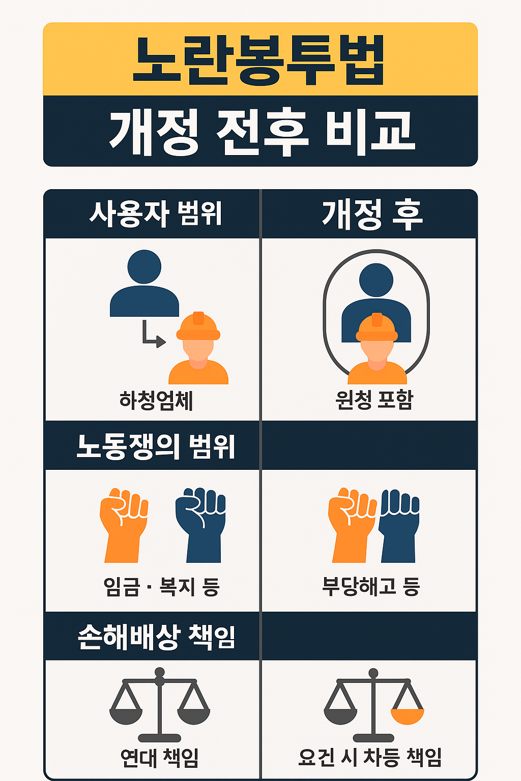 핵심은 ① 사용자 개념 확대, ② 노동쟁의 범위 확장, ③ 손해배상 청구 제한 세 가지입니다.