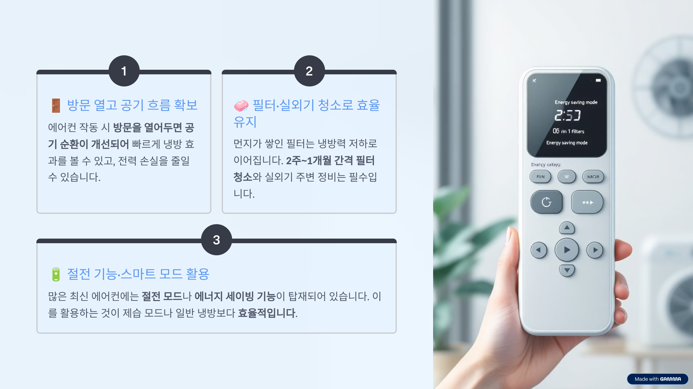 - 짧은 외출은 끄지 말고 약풍 유지